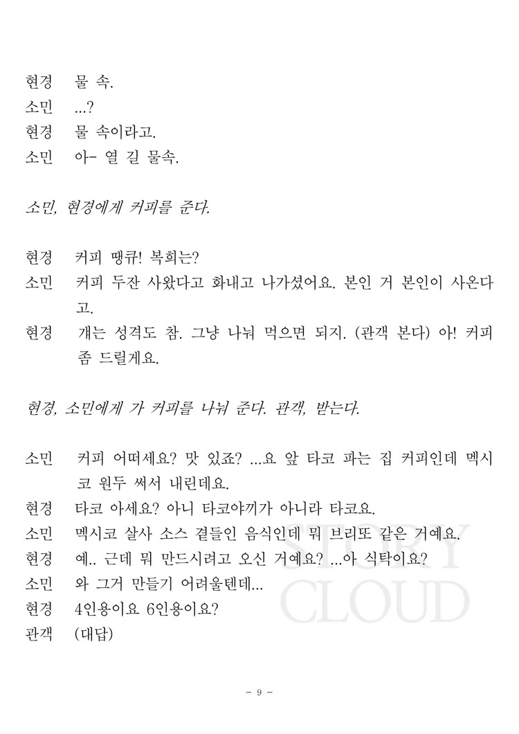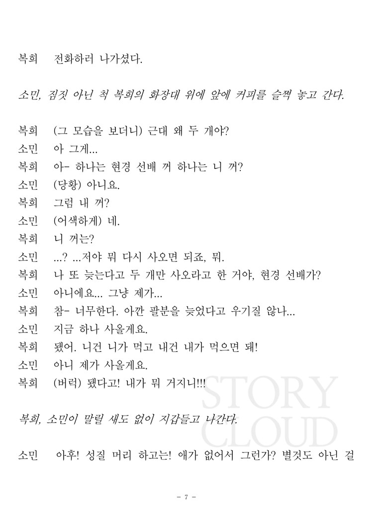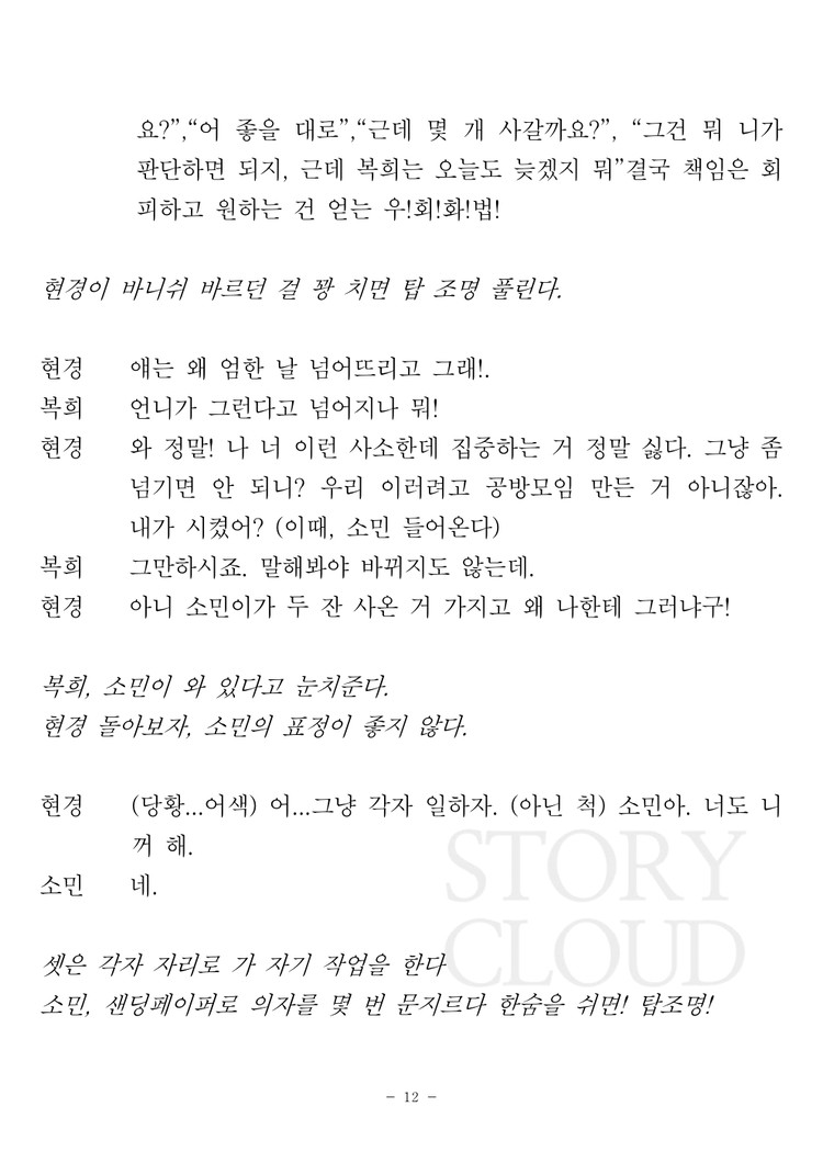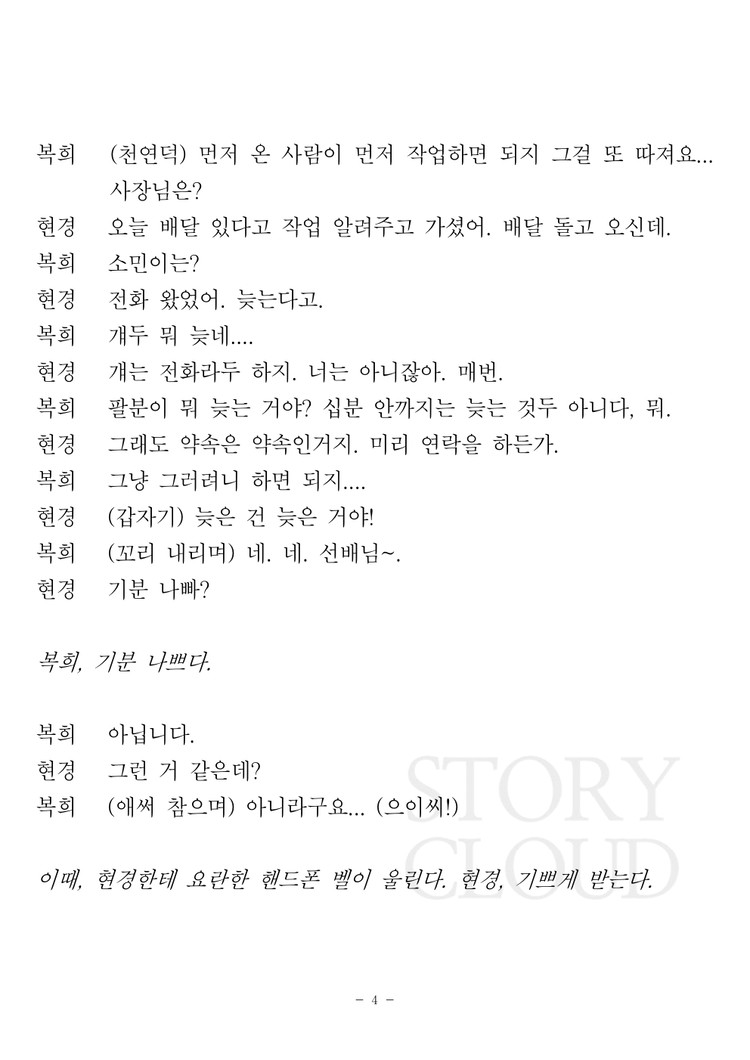 위와 같은 목적이 아니시라면 스토리클라우드 사이트 '스크립트' 카테고리에서 PDF파일을 구매하시거나 대본 미리보기를 통해 작품의 내용을 파악해보시는 것을 추천드립니다.