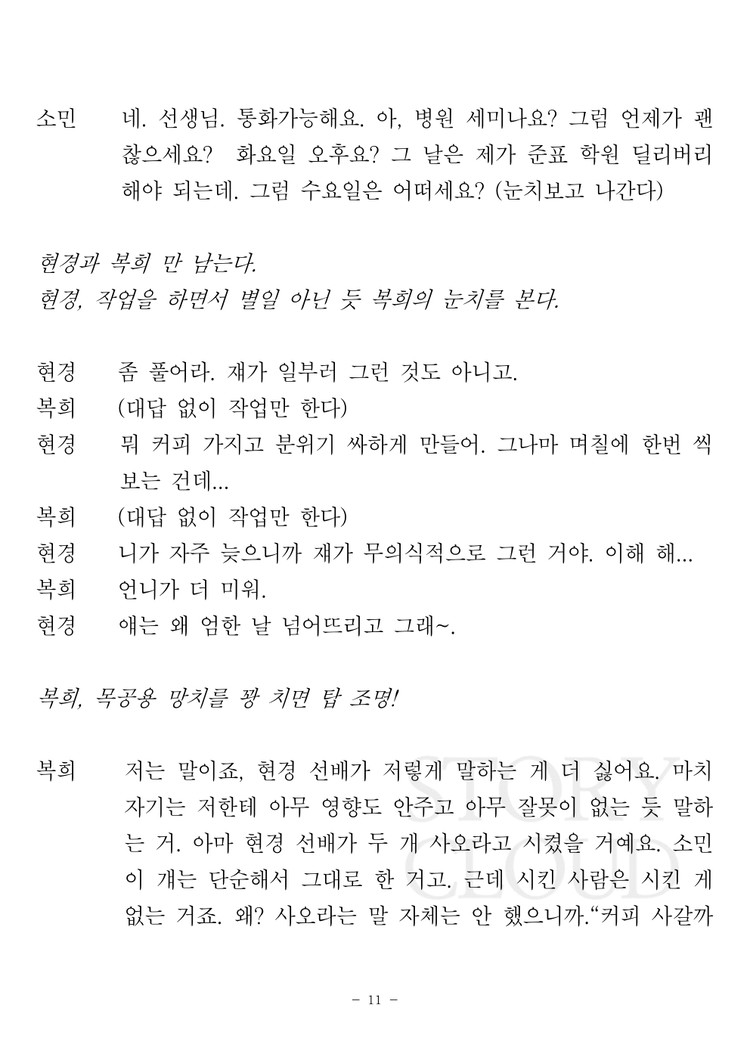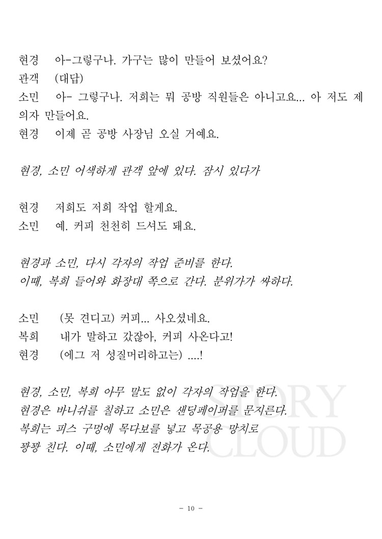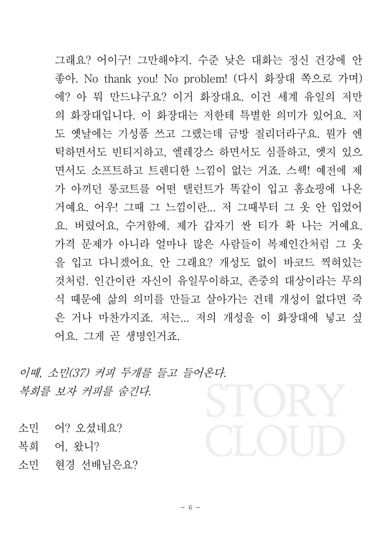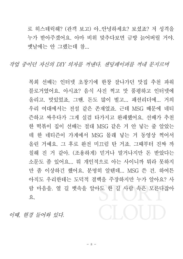 위와 같은 목적이 아니시라면 스토리클라우드 사이트 '스크립트' 카테고리에서 PDF파일을 구매하시거나 대본 미리보기를 통해 작품의 내용을 파악해보시는 것을 추천드립니다.