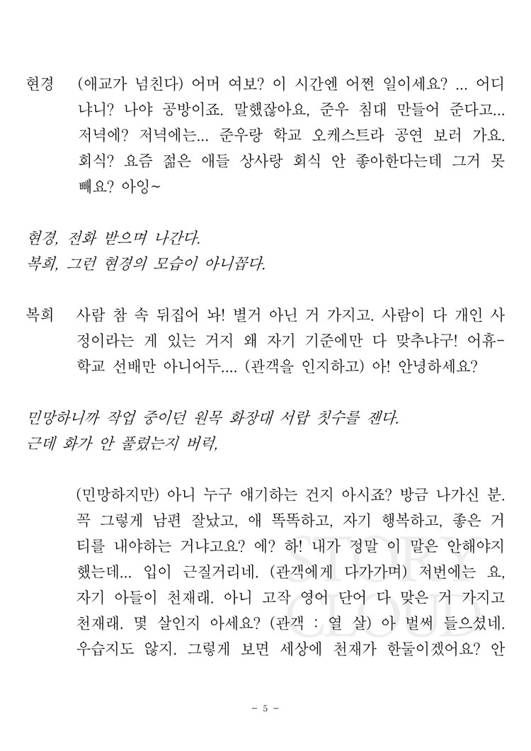 - 공연 대본 혹은 공연을 위한 수정본의 개인 소장은 가능하나, 인터넷 게시 혹은 재판매는 금지이며 발견 시, 법적 조치를 취합니다.