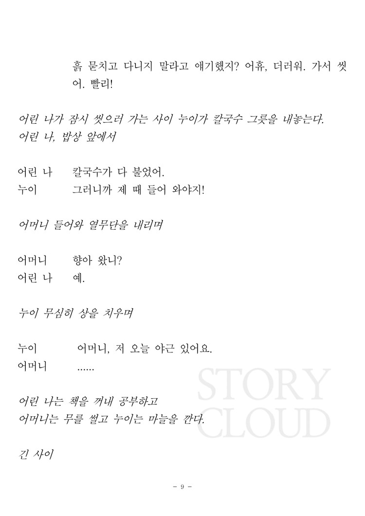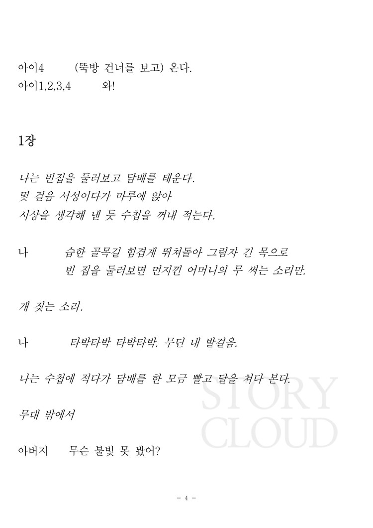 위와 같은 목적이 아니시라면 스토리클라우드 사이트 '스크립트' 카테고리에서 PDF파일을 구매하시거나 대본 미리보기를 통해 작품의 내용을 파악해보시는 것을 추천드립니다.