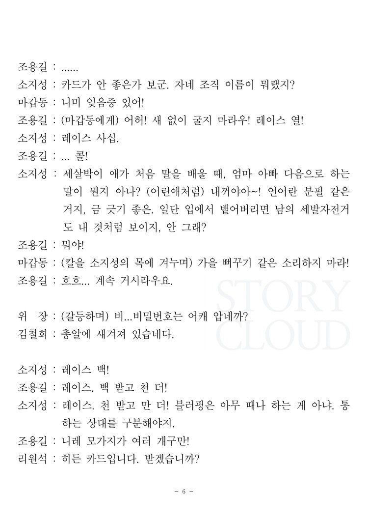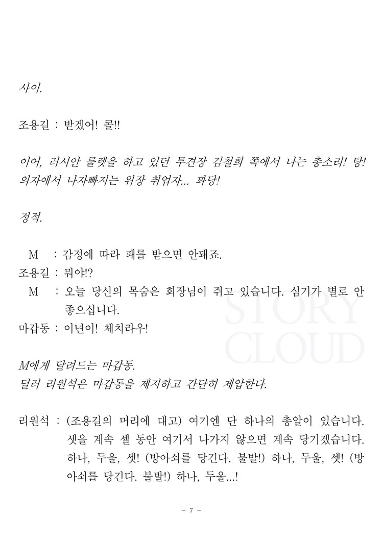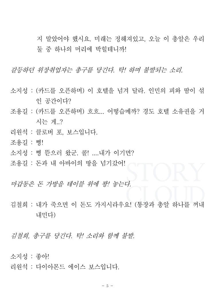 위와 같은 목적이 아니시라면 스토리클라우드 사이트 '스크립트' 카테고리에서 PDF파일을 구매하시거나 대본 미리보기를 통해 작품의 내용을 파악해보시는 것을 추천드립니다.