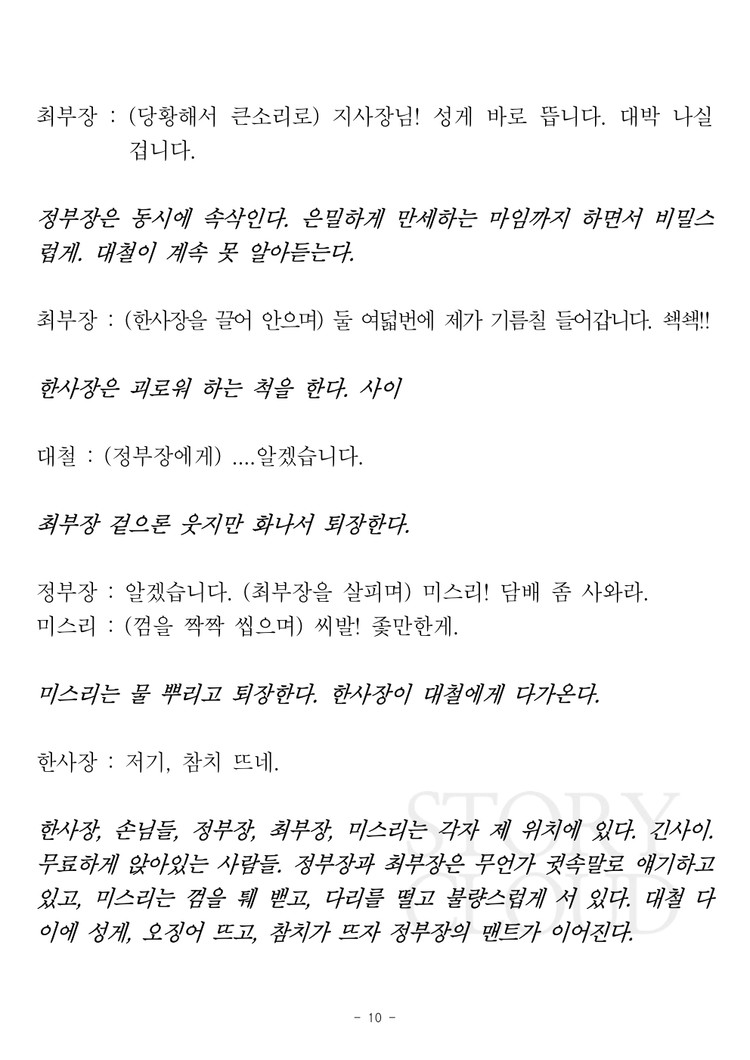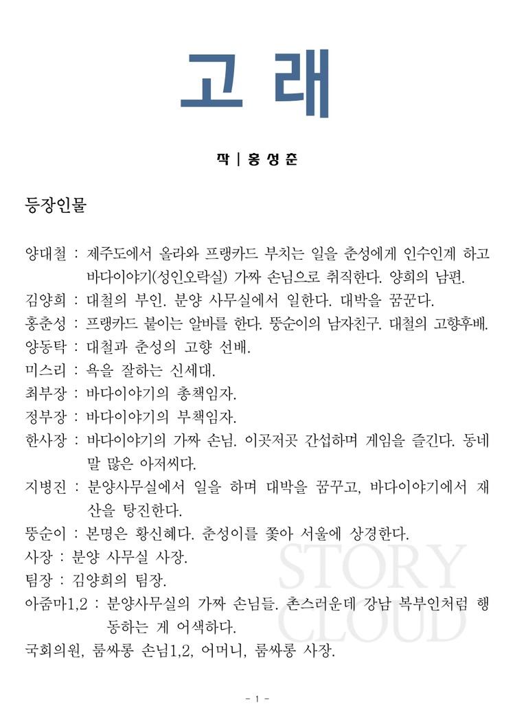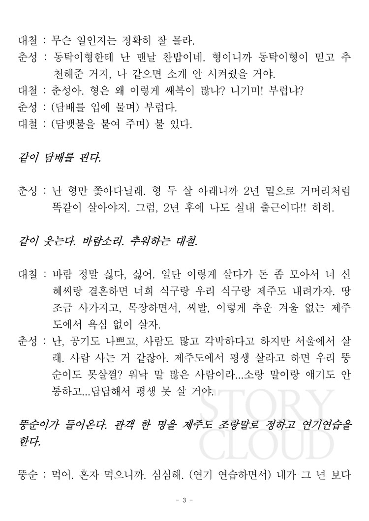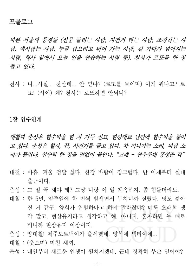 위와 같은 목적이 아니시라면 스토리클라우드 사이트 '스크립트' 카테고리에서 PDF파일을 구매하시거나 대본 미리보기를 통해 작품의 내용을 파악해보시는 것을 추천드립니다.