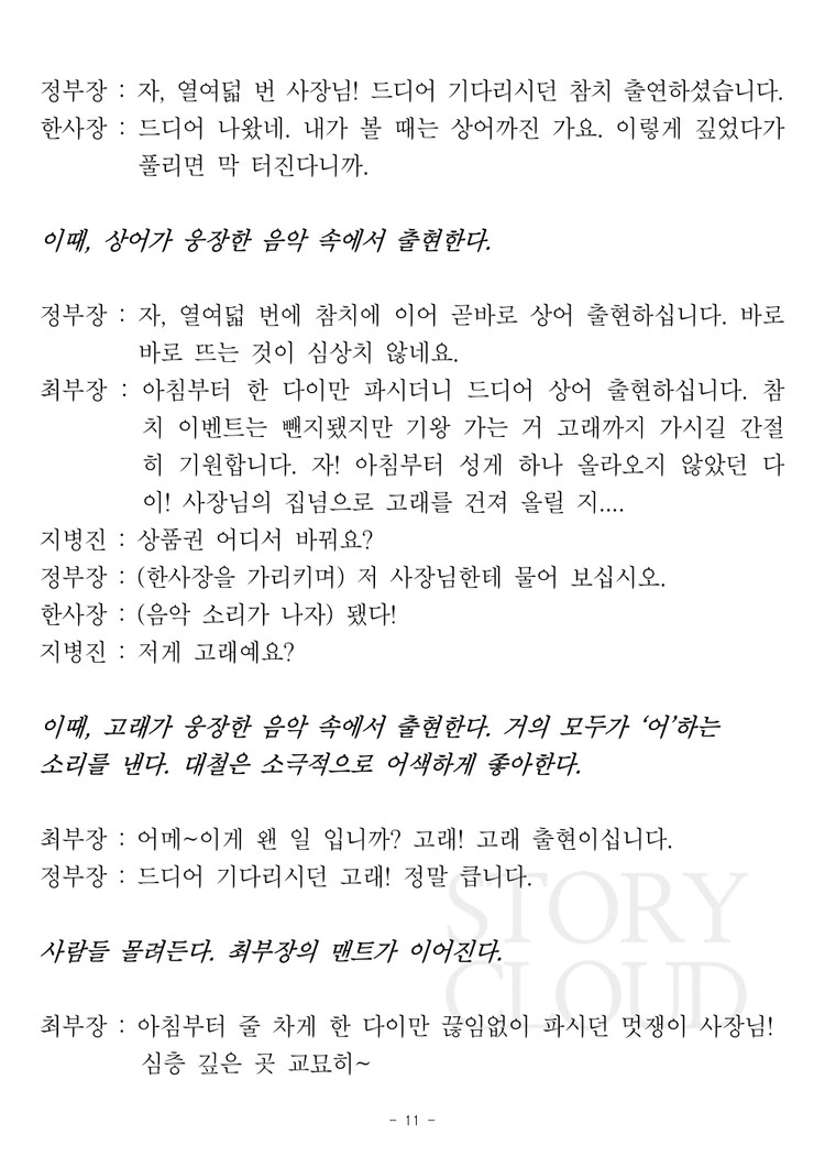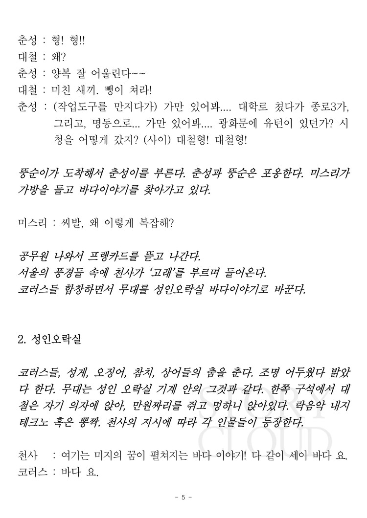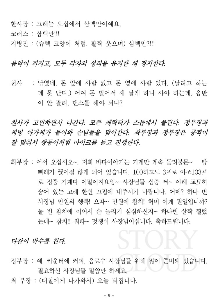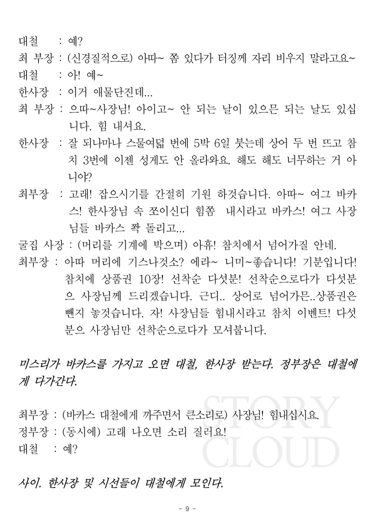 위와 같은 목적이 아니시라면 스토리클라우드 사이트 '스크립트' 카테고리에서 PDF파일을 구매하시거나 대본 미리보기를 통해 작품의 내용을 파악해보시는 것을 추천드립니다.
