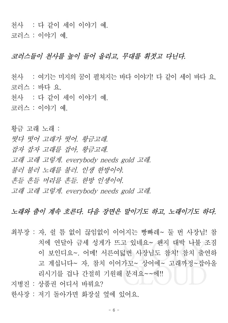 - 공연 대본 혹은 공연을 위한 수정본의 개인 소장은 가능하나, 인터넷 게시 혹은 재판매는 금지이며 발견 시, 법적 조치를 취합니다.
