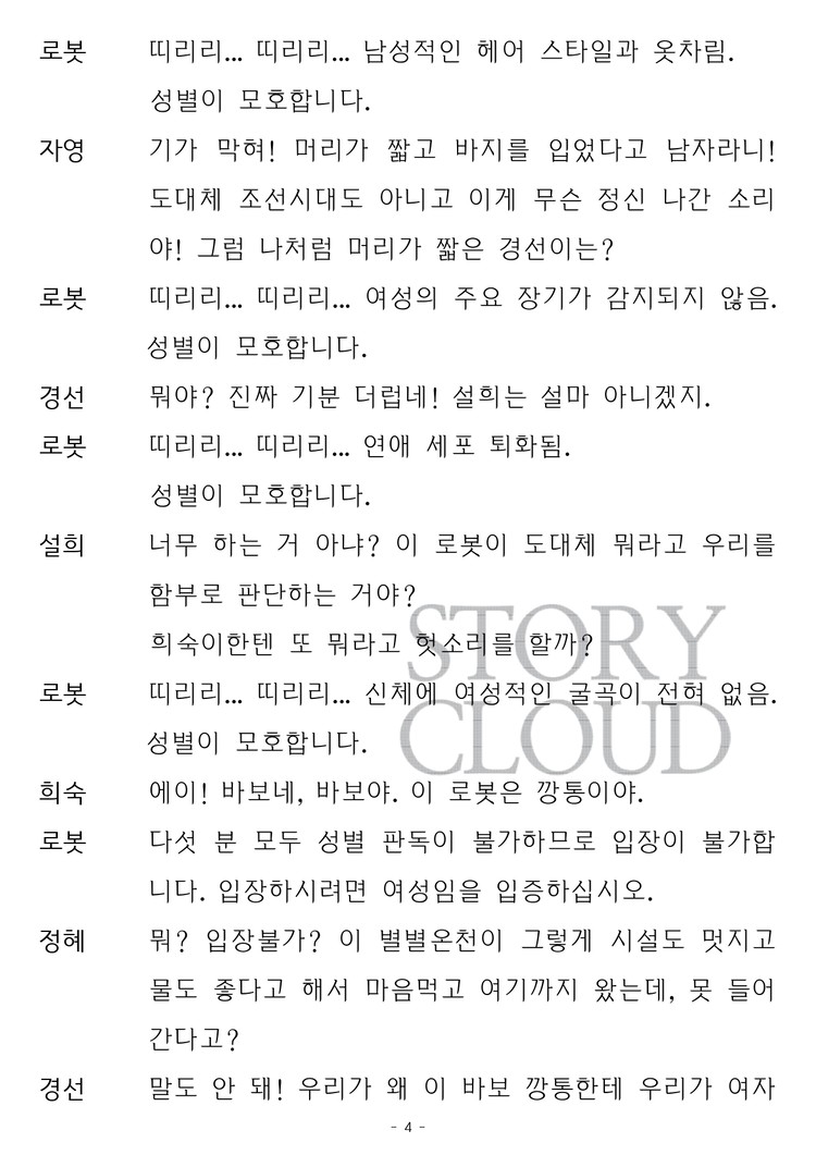 위와 같은 목적이 아니시라면 스토리클라우드 사이트 '스크립트' 카테고리에서 PDF파일을 구매하시거나 대본 미리보기를 통해 작품의 내용을 파악해보시는 것을 추천드립니다.