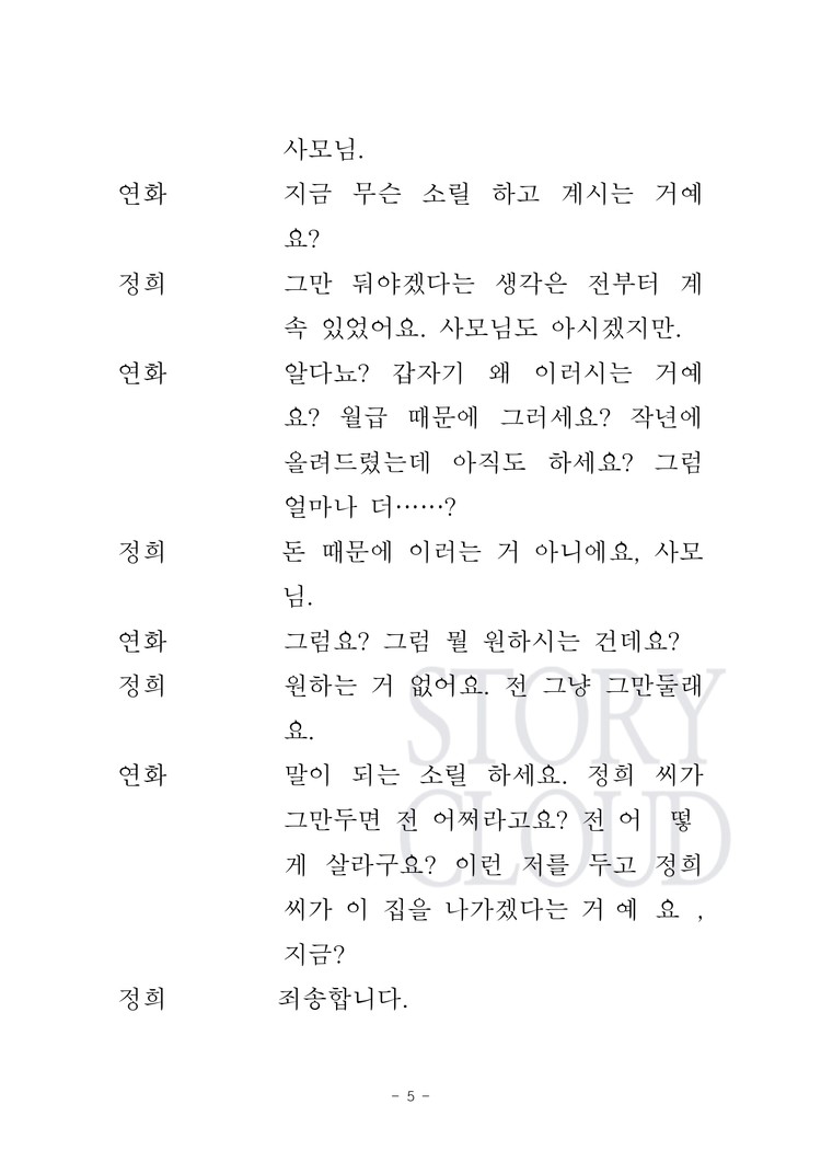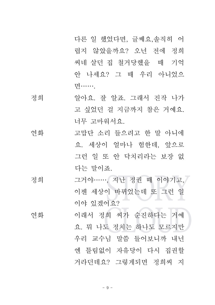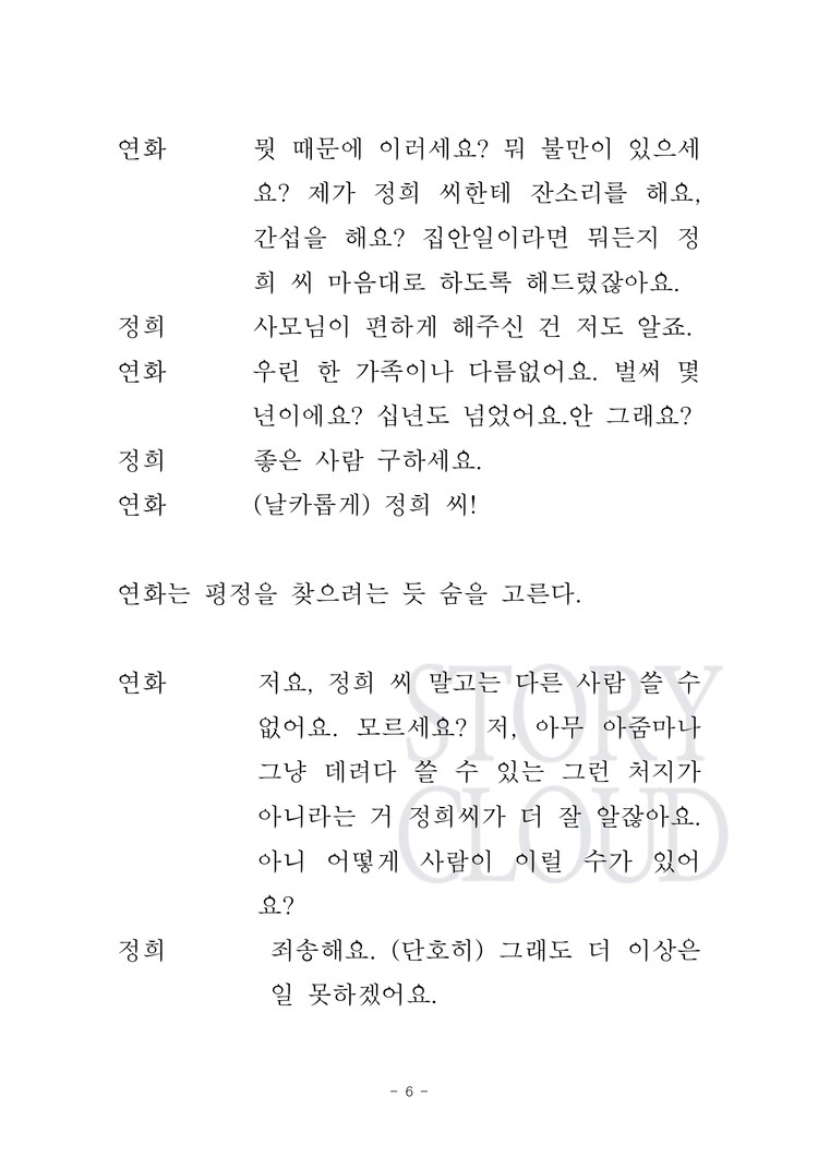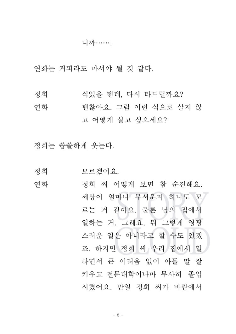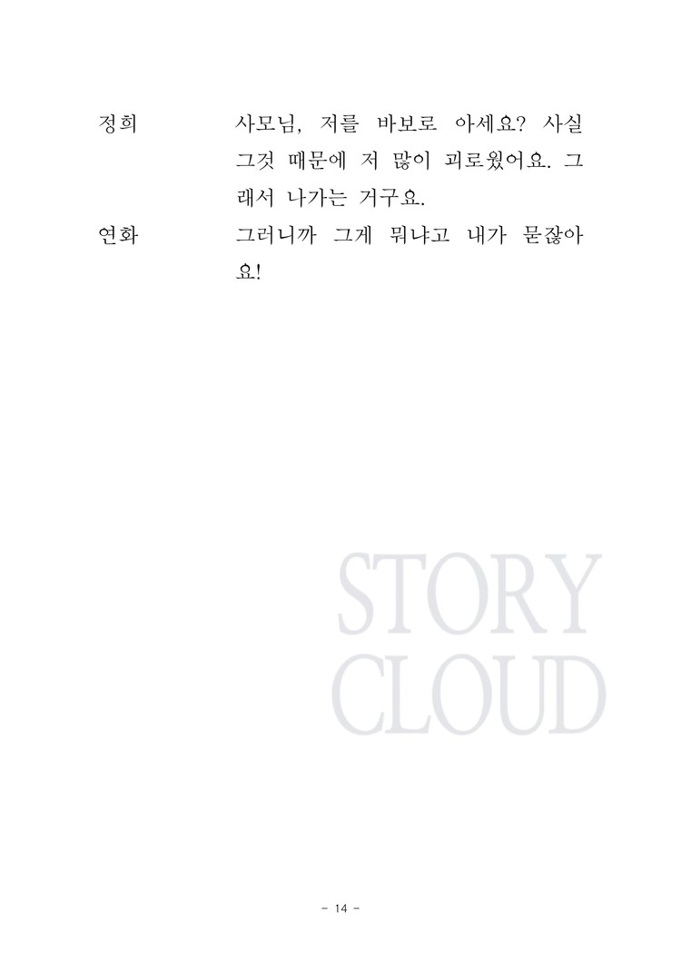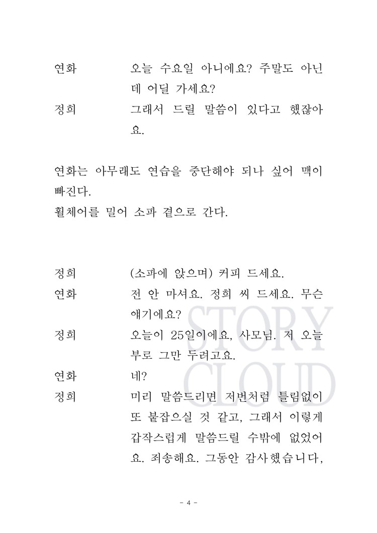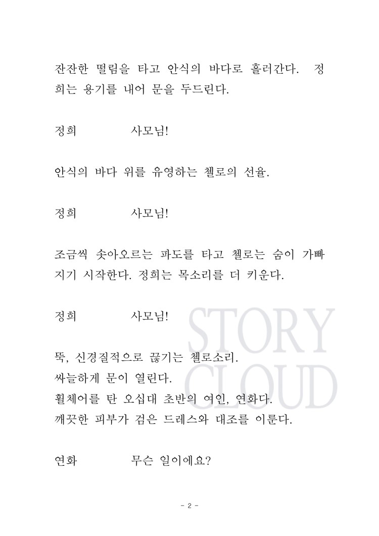 위와 같은 목적이 아니시라면 스토리클라우드 사이트 '스크립트' 카테고리에서 PDF파일을 구매하시거나 대본 미리보기를 통해 작품의 내용을 파악해보시는 것을 추천드립니다.