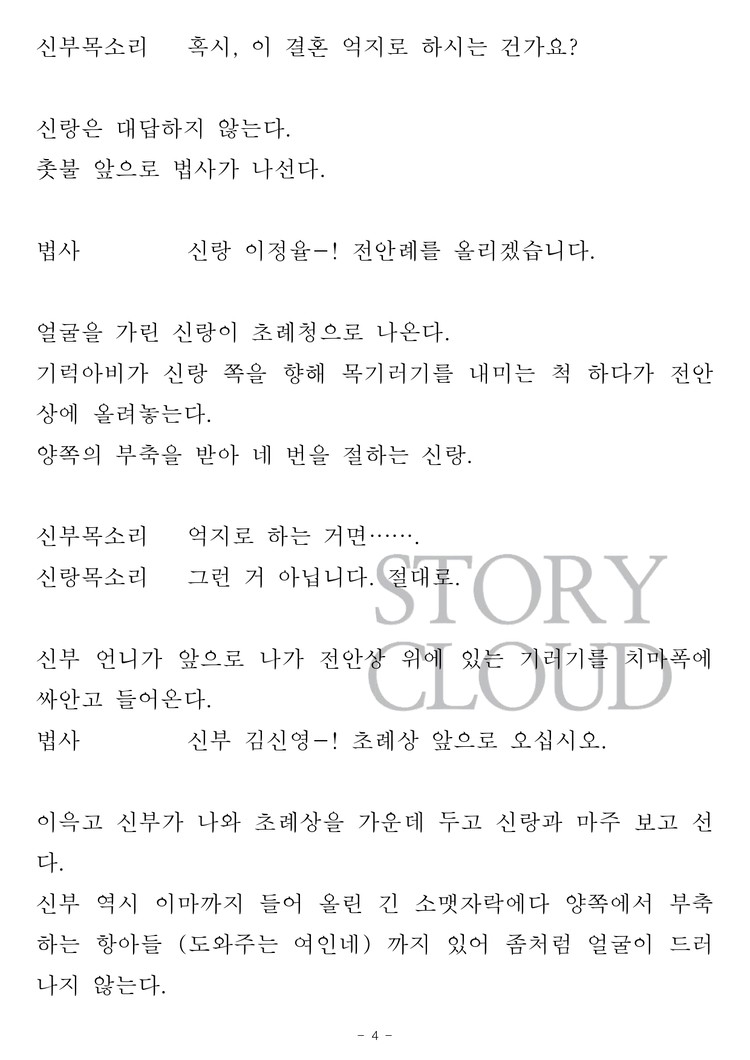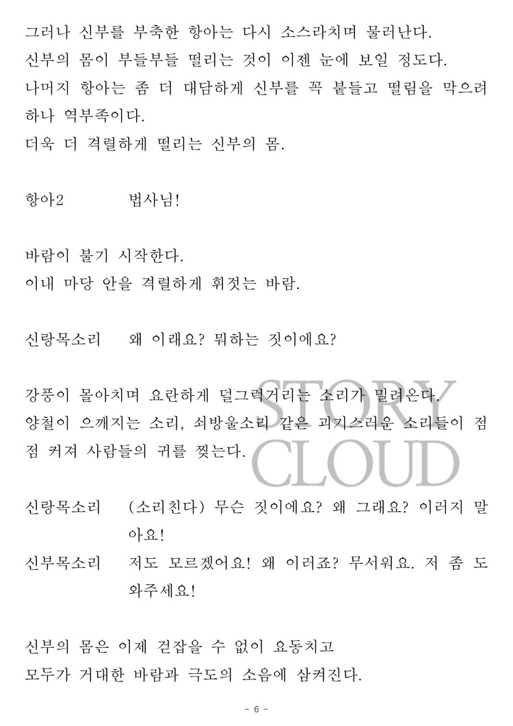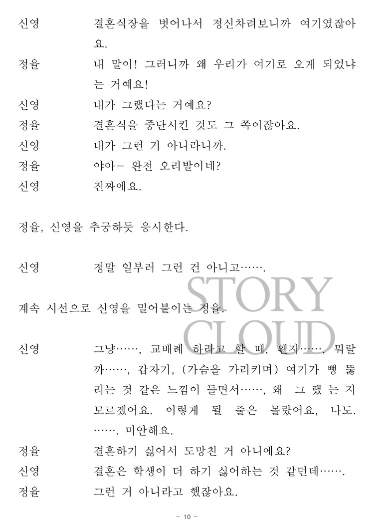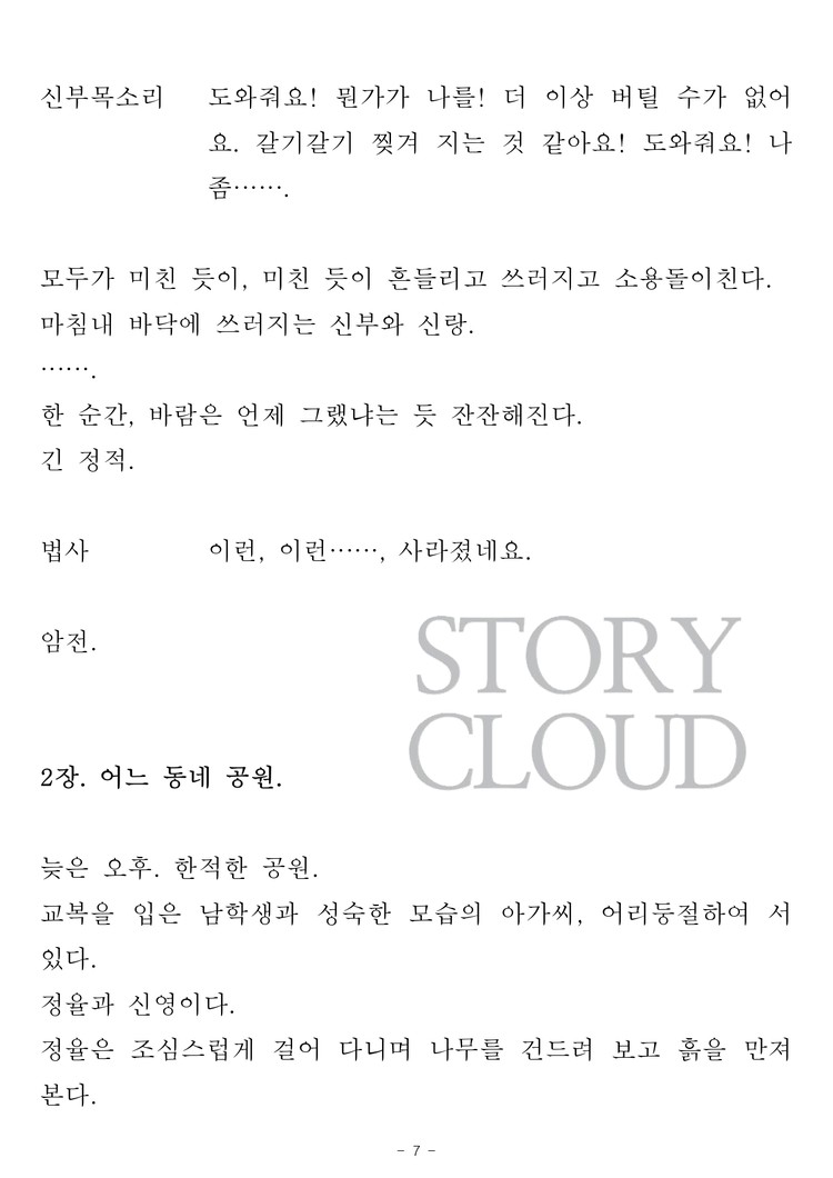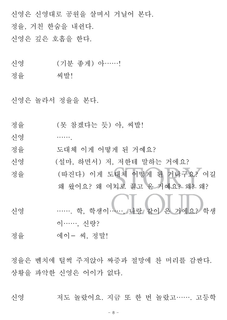 위와 같은 목적이 아니시라면 스토리클라우드 사이트 '스크립트' 카테고리에서 PDF파일을 구매하시거나 대본 미리보기를 통해 작품의 내용을 파악해보시는 것을 추천드립니다.
