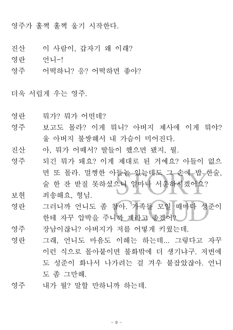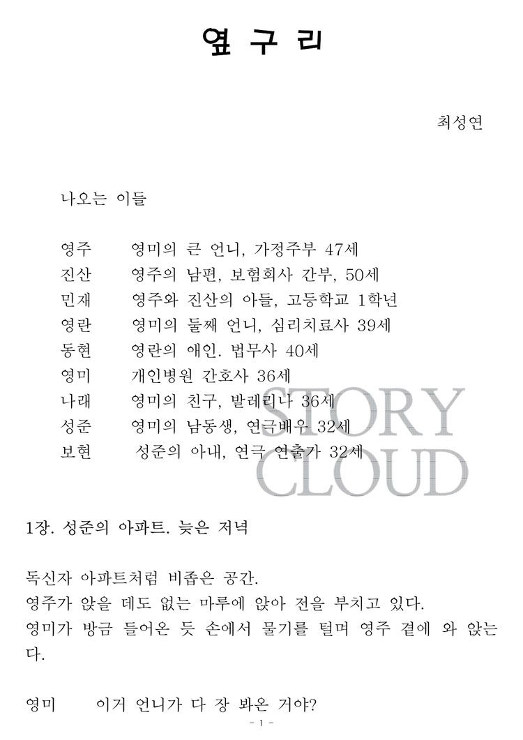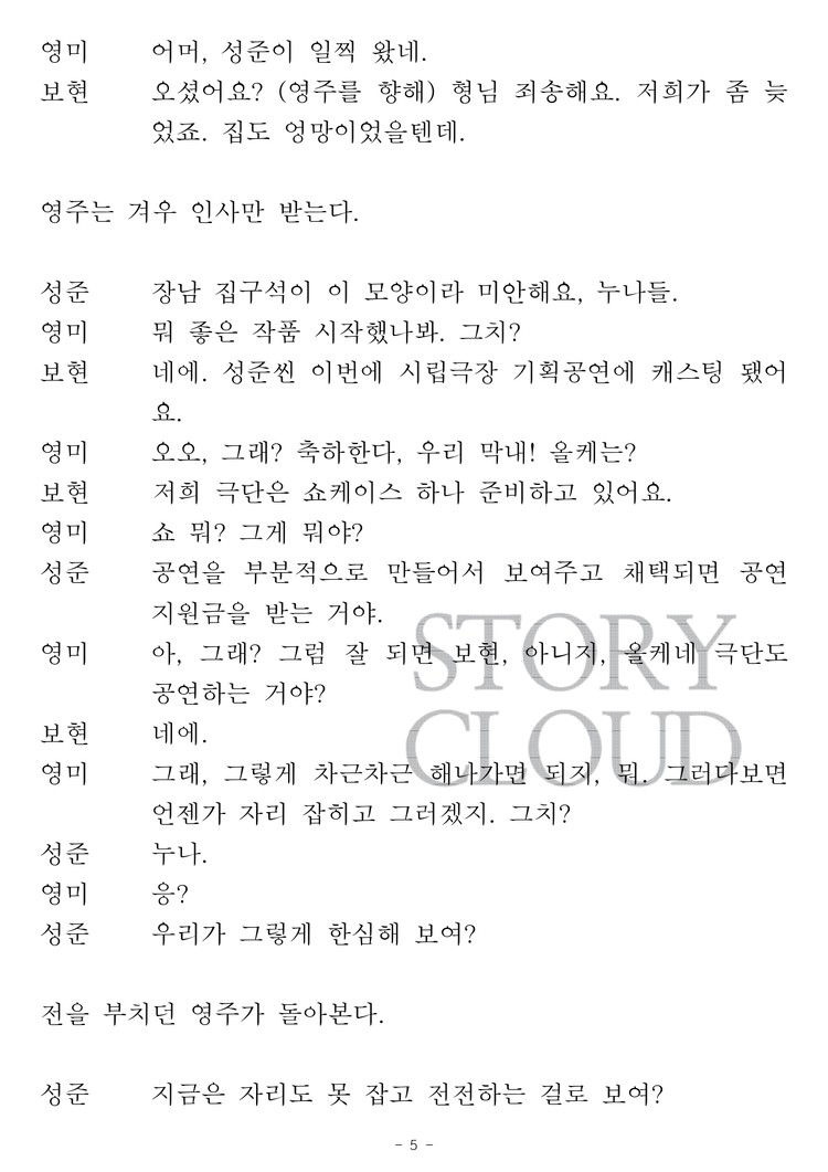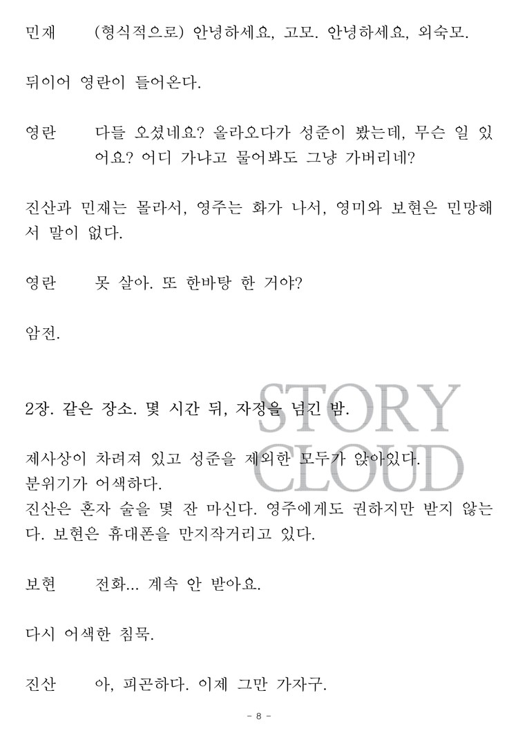 위와 같은 목적이 아니시라면 스토리클라우드 사이트 '스크립트' 카테고리에서 PDF파일을 구매하시거나 대본 미리보기를 통해 작품의 내용을 파악해보시는 것을 추천드립니다.