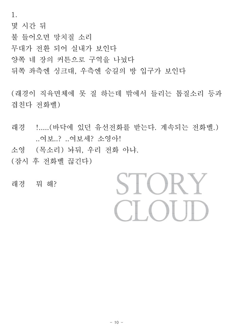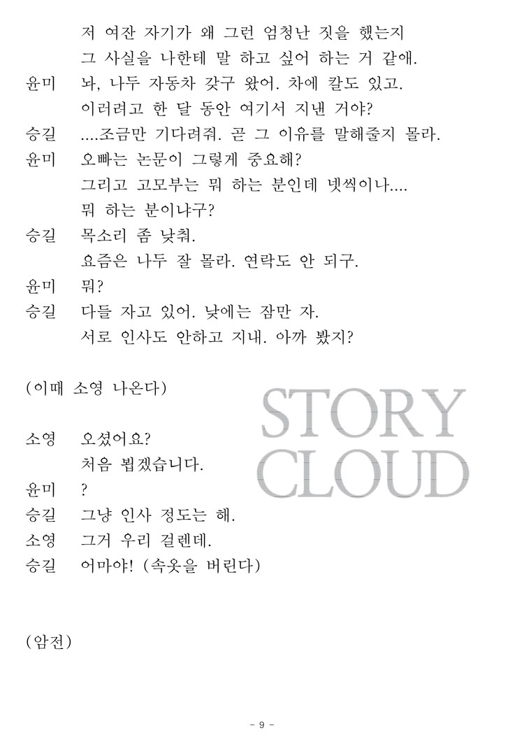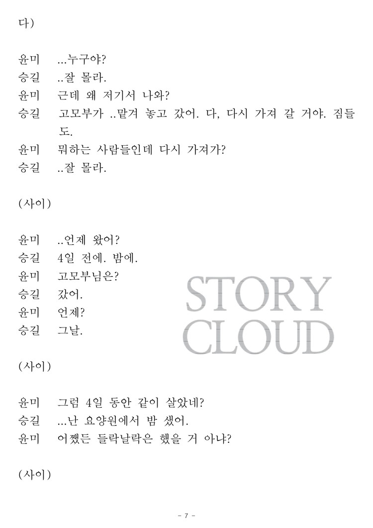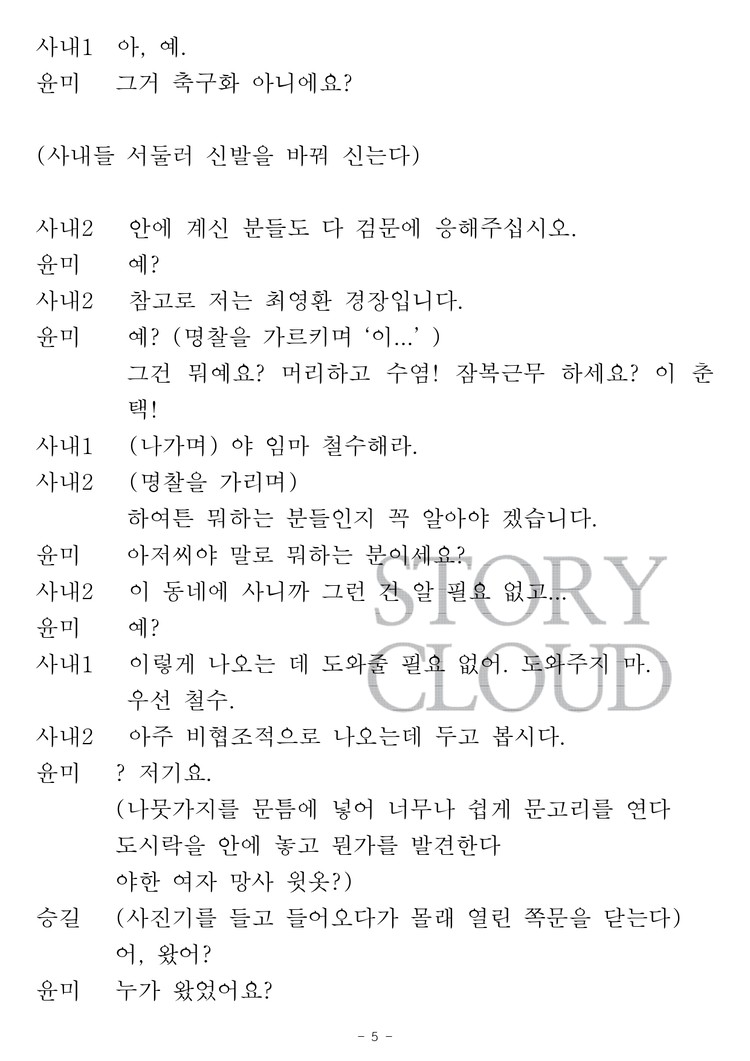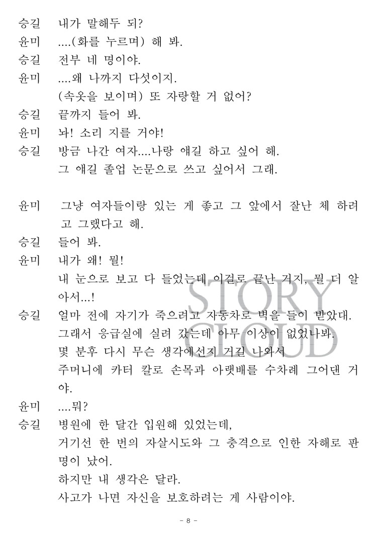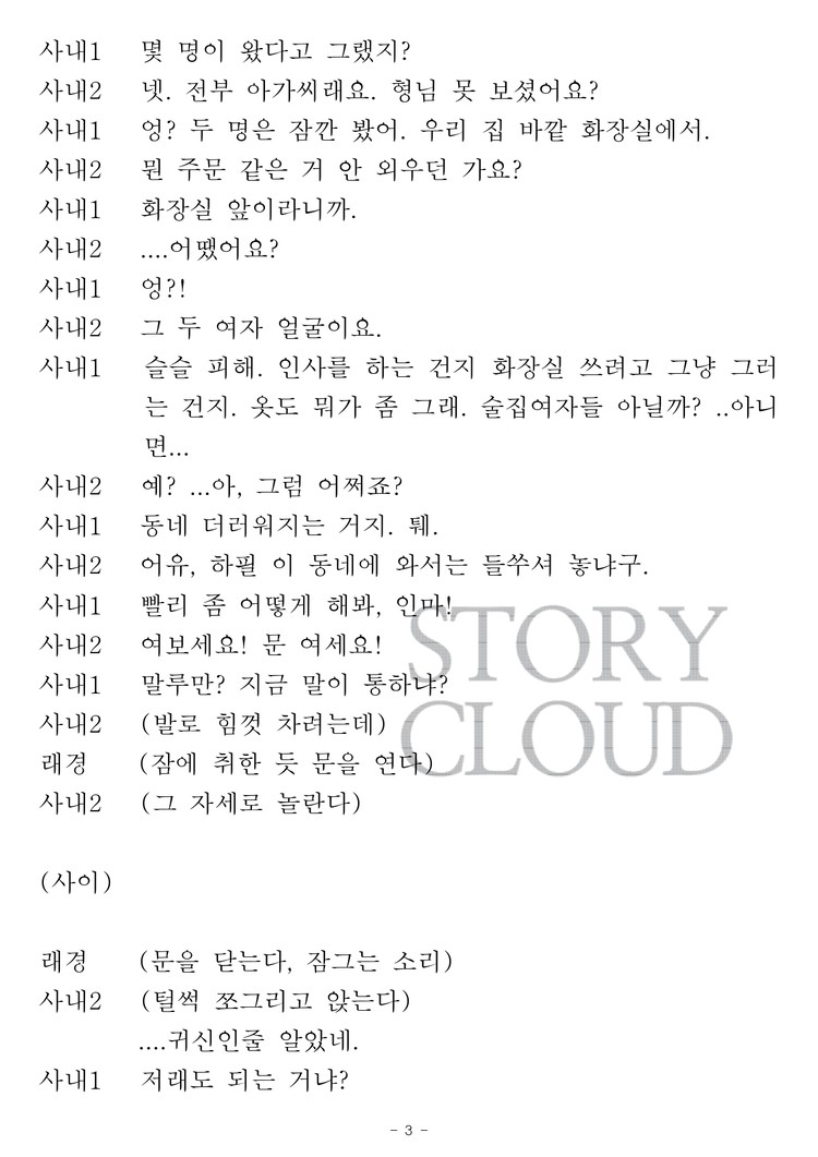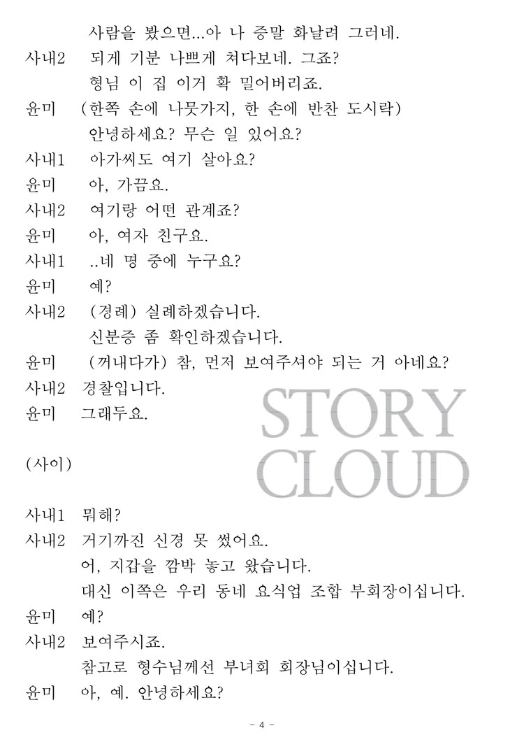 위와 같은 목적이 아니시라면 스토리클라우드 사이트 '스크립트' 카테고리에서 PDF파일을 구매하시거나 대본 미리보기를 통해 작품의 내용을 파악해보시는 것을 추천드립니다.