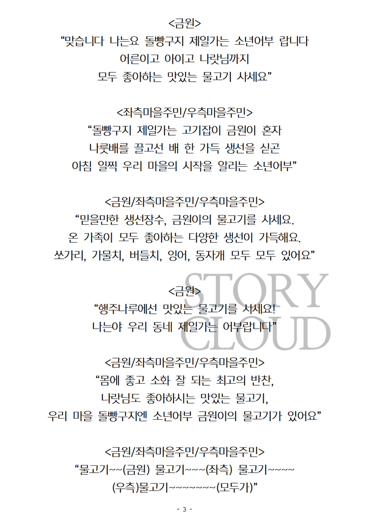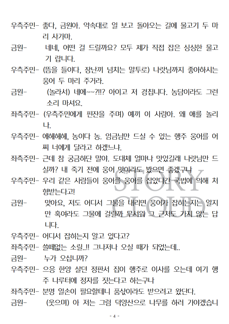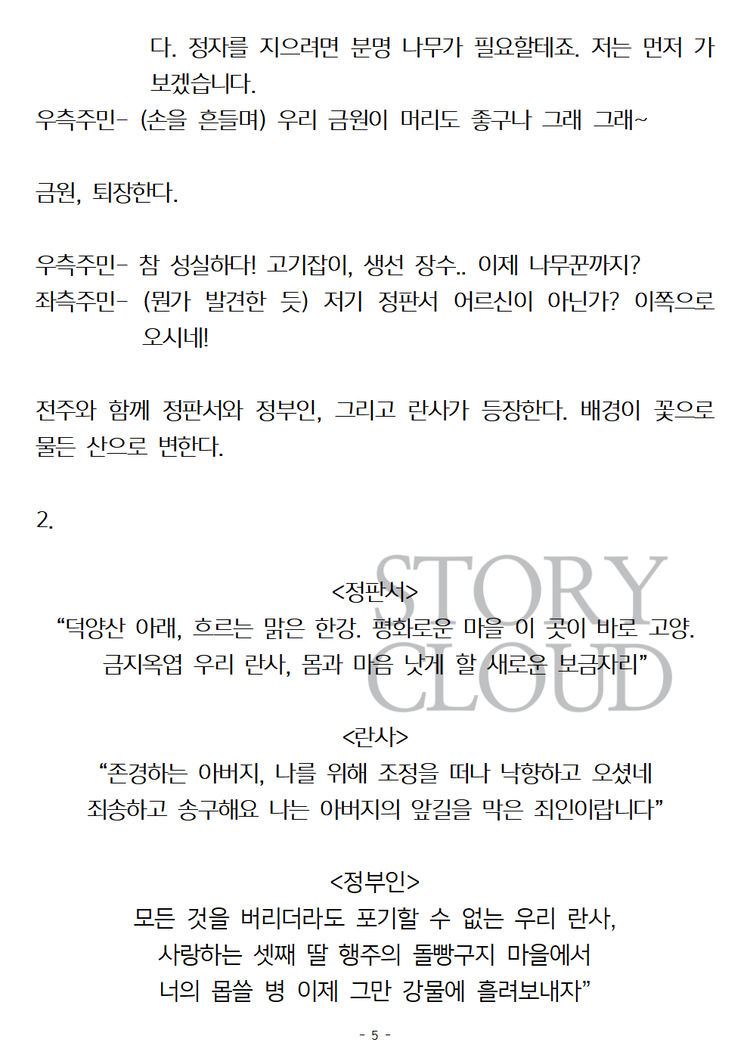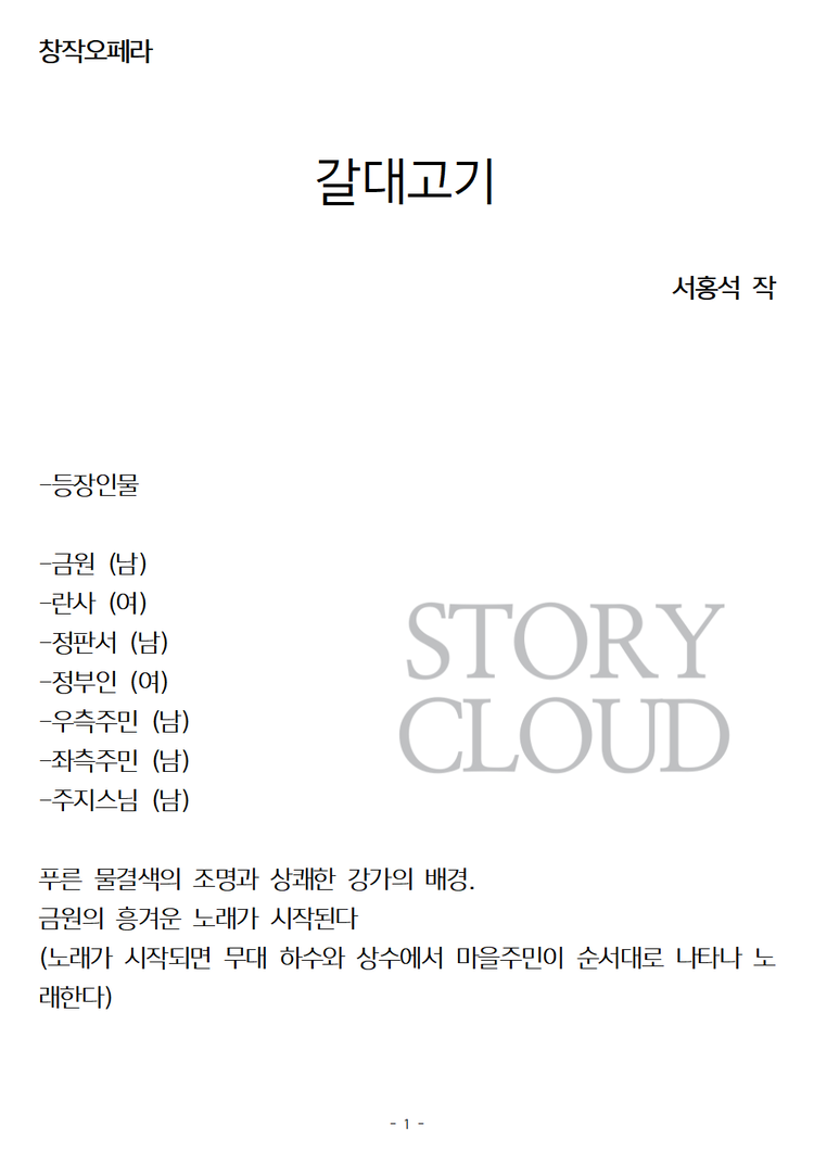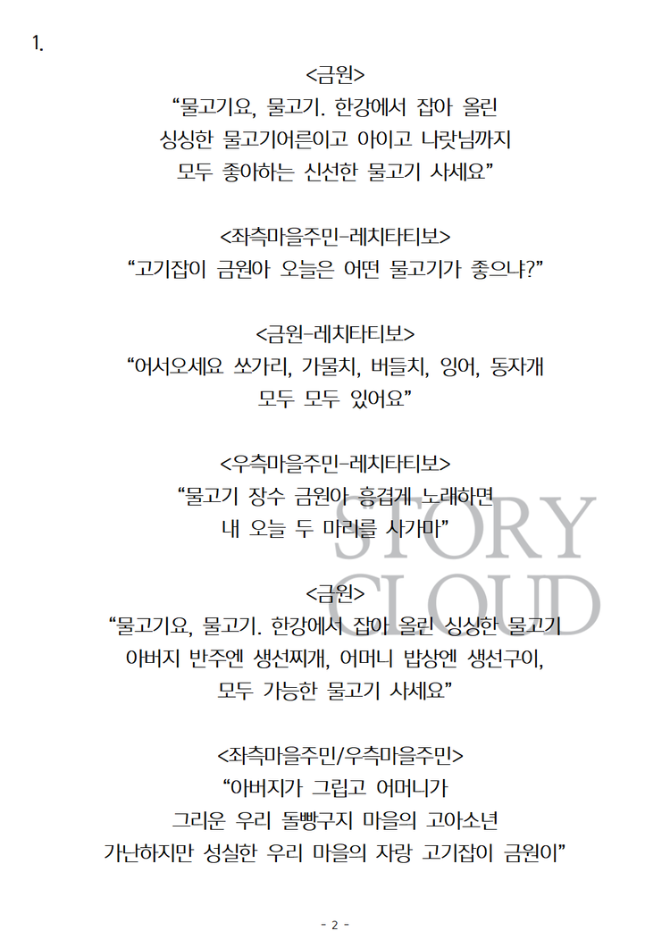 위와 같은 목적이 아니시라면 스토리클라우드 사이트 '스크립트' 카테고리에서 PDF파일을 구매하시거나 대본 미리보기를 통해 작품의 내용을 파악해보시는 것을 추천드립니다.