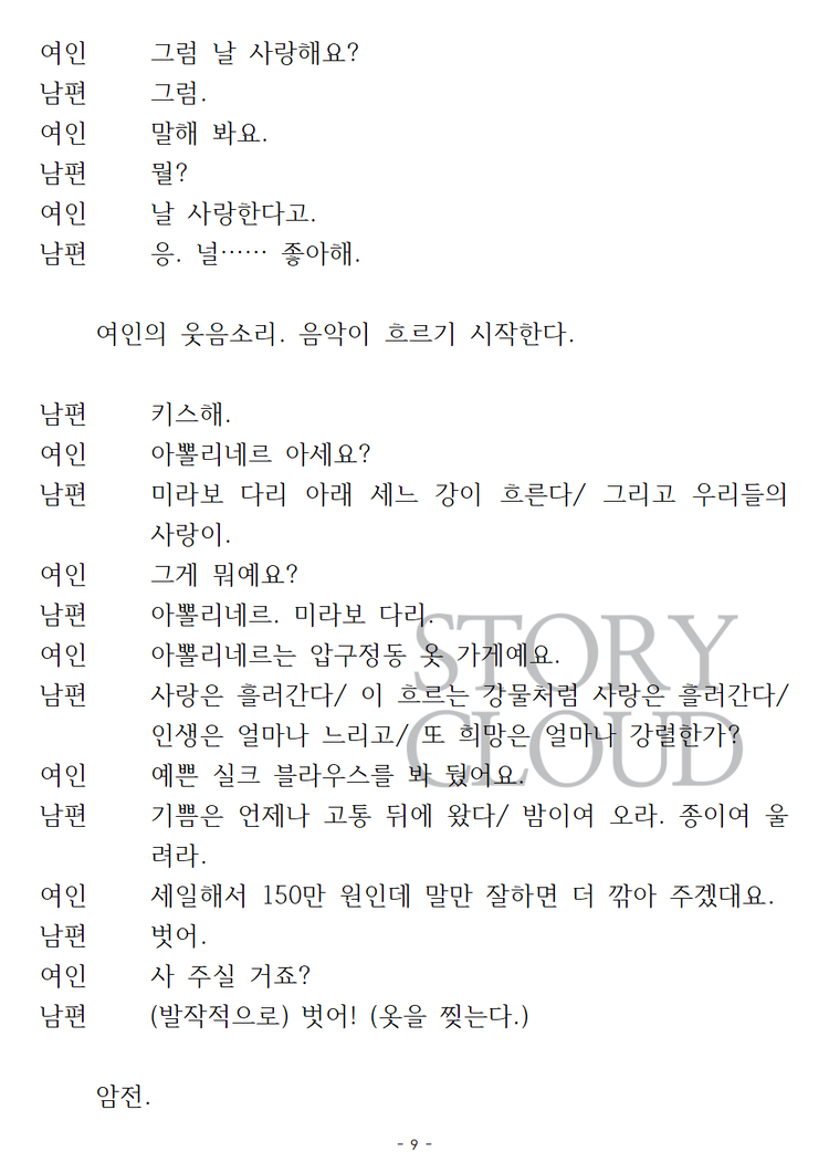 - 공연 대본의 개인 소장은 가능하나, 온라인 게시 및 재판매 금지 (위반 시 법적 조치)