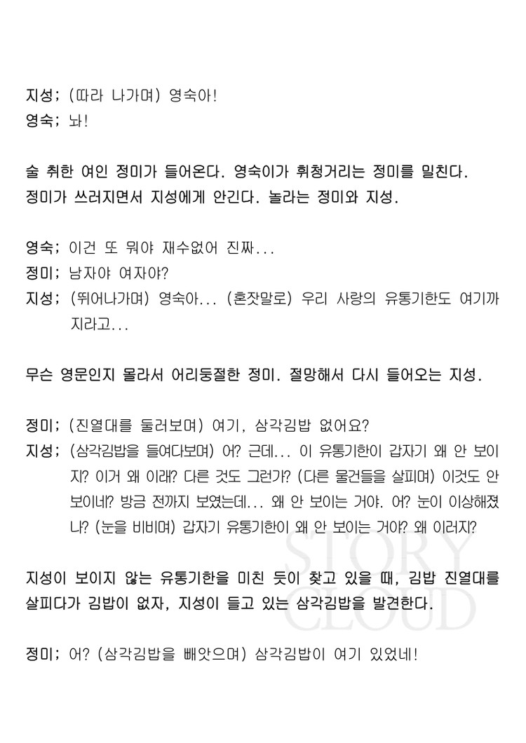 직장에서 좌천당하자, 그동안 사귀던 애인 영숙이가 “우리 사랑의 유통기한은 여기까지야!”라며 지성을 떠난다.