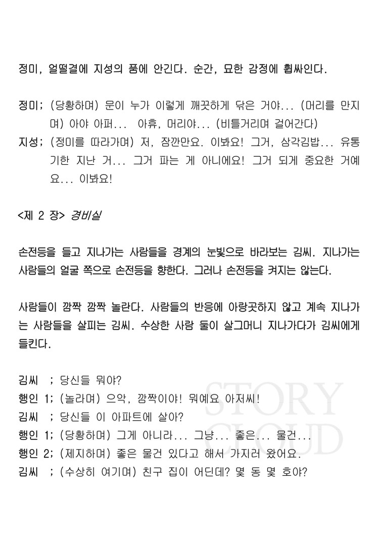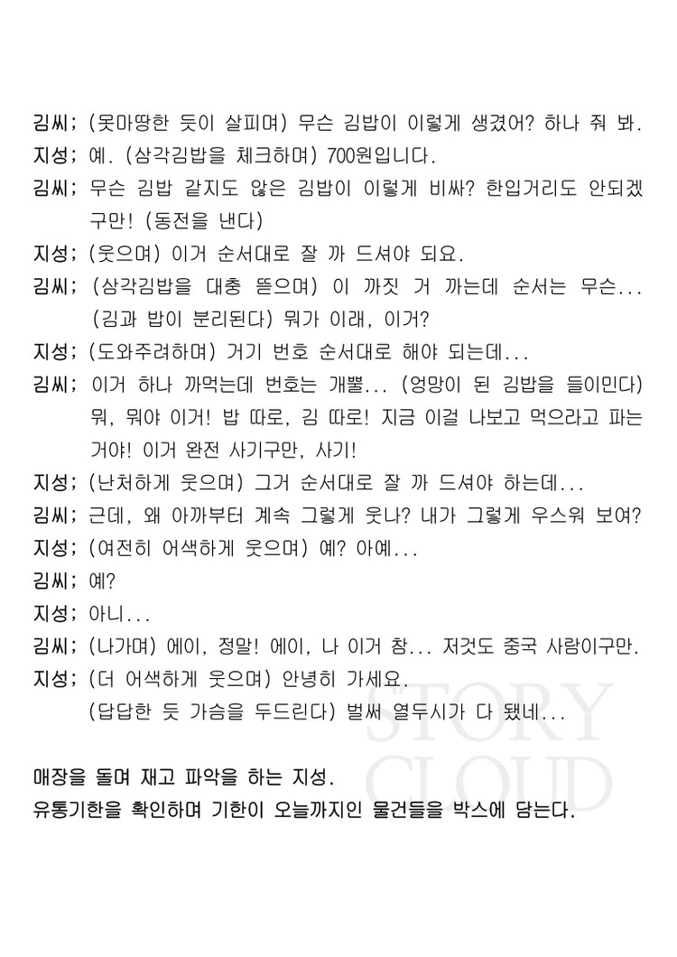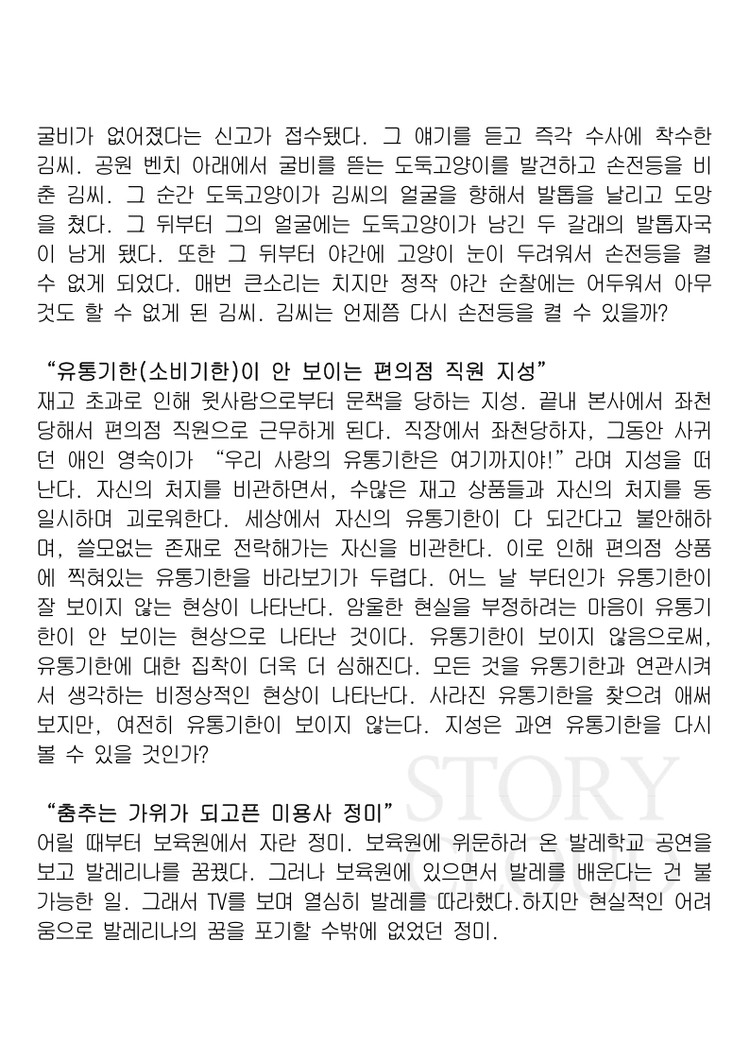 지성이 일하는 편의점 근처에 “춤추는 미용실”이 있다. 편의점과 미용실이 있는 아파트 상가까지 돌보는 경비원 김씨.