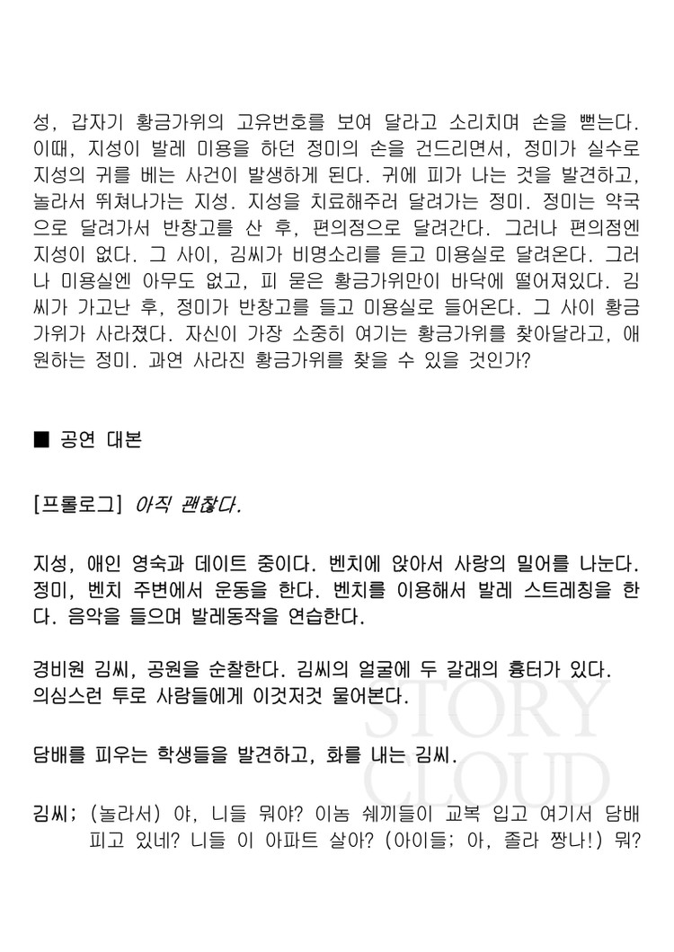 연인 사이인 지성과 영숙의 데이트 모습이 행복하게 펼쳐진다. 지성은 유통업계에서 근무한다. 어느 날, 직장에서 재고 초과로 본사에서 좌천당하는 지성. 그로인해, 사랑의 유통기한이 끝났다며 영숙에게 차이는 지성. 자신의 처지를 비관하며 유통기한을 증오하는 지성. 유통기한에 대한 증오가 유통기한 거부 현상으로 나타난다. 급기야 유통기한이 보이지 않게 된 지성. 이로 인한 불안감으로 유통기한에 대한 심한 집착 현상을 보이는 지성. 지성이 일하는 편의점 근처에 “춤추는 미용실”이 있다. 편의점과 미용실이 있는 아파트 상가까지 돌보는 경비원 김씨. “춤추는 미용실” 개업 후 10,000번째 손님으로 미용실에 입장하게 된 지성. ‘10,000번째 손님에게 황금가위로 머리를 깎아주는 이벤트’에 당첨된 지성. 정미는 감격스러웠던 순간을 떠올리며, 흥분에 들떠서 황금가위로 발레 미용을 선보인다. 황금가위의 고유번호에 예민하게 관심을 보이는 지성. 지성, 갑자기 황금가위의 고유번호를 보여 달라고 소리치며 손을 뻗는다. 이때, 지성이 발레 미용을 하던 정미의 손을 건드리면서, 정미가 실수로 지성의 귀를 베는 사건이 발생하게 된다. 귀에 피가 나는 것을 발견하고, 놀라서 뛰쳐나가는 지성. 지성을 치료해주러 달려가는 정미. 정미는 약국으로 달려가서 반창고를 산후, 편의점으로 달려간다. 그러나 편의점엔 지성이 없다. 그 사이, 김씨가 비명소리를 듣고 미용실로 달려온다. 그러나 미용실엔 아무도 없고, 피 묻은 황금가위만이 바닥에 떨어져있다. 김씨가 가고난 후, 정미가 반창고를 들고 미용실로 들어온다. 그 사이 황금가위가 사라졌다. 자신이 가장 소중히 여기는 황금가위를 찾아달라고, 애원하는 정미. 과연 사라진 황금가위를 찾을 수 있을 것인가?