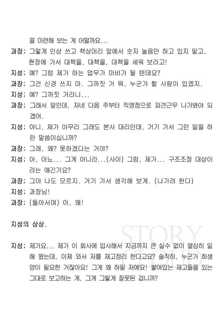 자신의 처지를 비관하면서, 수많은 재고 상품들과 자신의 처지를 동일시하며 괴로워한다.