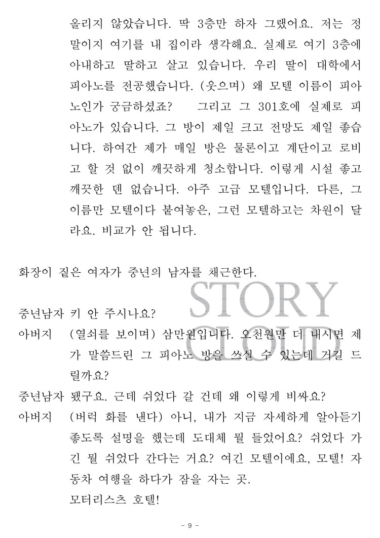 그러나 더 괴로운 것은 내 모습이 보잘것없다고 해서 아름다움을 쉽게 포기할 수는 없다는 사실이다. <모텔 피아노>의 미정에게 피아노는 그렇게 닿을 수 없는 이상향의 아름다움이다. 물론 미정은 일견 평범해 보인다. 심한 밑바닥 인생을 사는 것도 아니다. 그러나 중요한 것은 그녀 스스로 느끼는 자신의 모습이다. 이 정도면 괜찮다고 자위하면서 고통 없이 살아갈 수 있으련만, 피아노를 만났음으로 인해 이미 스스로에게 들켜버린 민감한 감수성이 그녀를 가만 놔두지 않는 것이다.