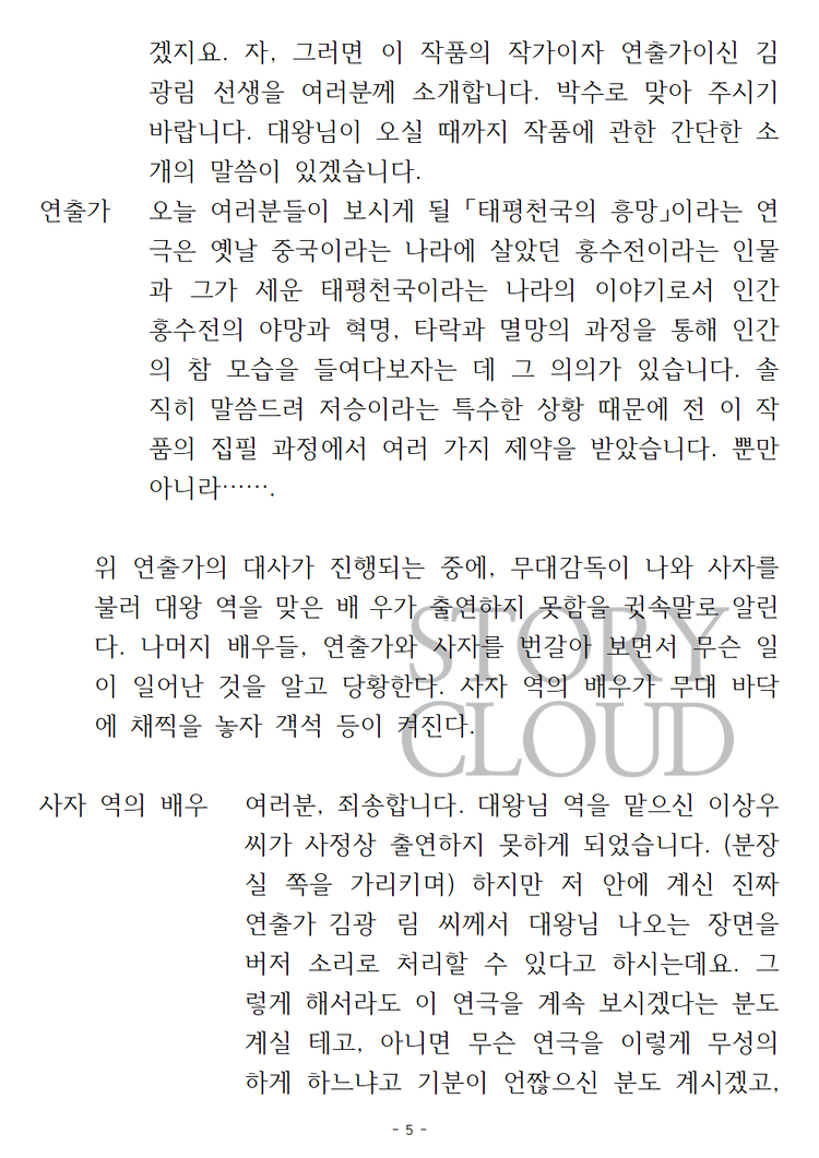 📢 본 사용권은 상연(上演-연극 따위를 무대에서 하여 관객에게 보이다)을 전제로 희곡의 창작자에게 저작권을 구매하는 것과 동일합니다. 위와 같은 목적이 아니시라면 스토리클라우드 사이트 '스크립트' 카테고리에서 PDF파일을 구매하시거나 대본 미리보기를 통해 작품의 내용을 파악해보시는 것을 추천드립니다. 사용권에 포함된 한글 대본을 내려받기한 후 구매취소를 하시면 부득이하게 구매 금액의 10% 차감 후 환불이 됨을 알려드립니다.